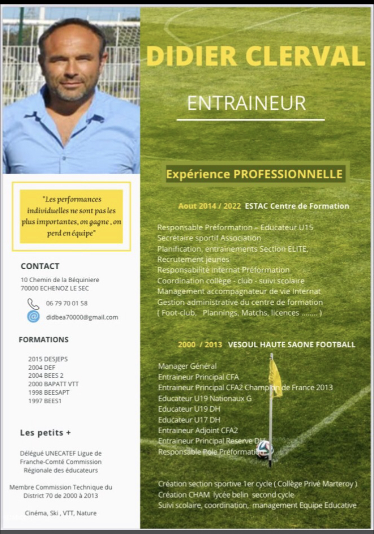 Puis ayant intégrer le centre de formation de l Estac club de ligue 1 comme responsable de la Preformation et secrétaire sportif de l Association je suis à la rechercher d un nouveau projet