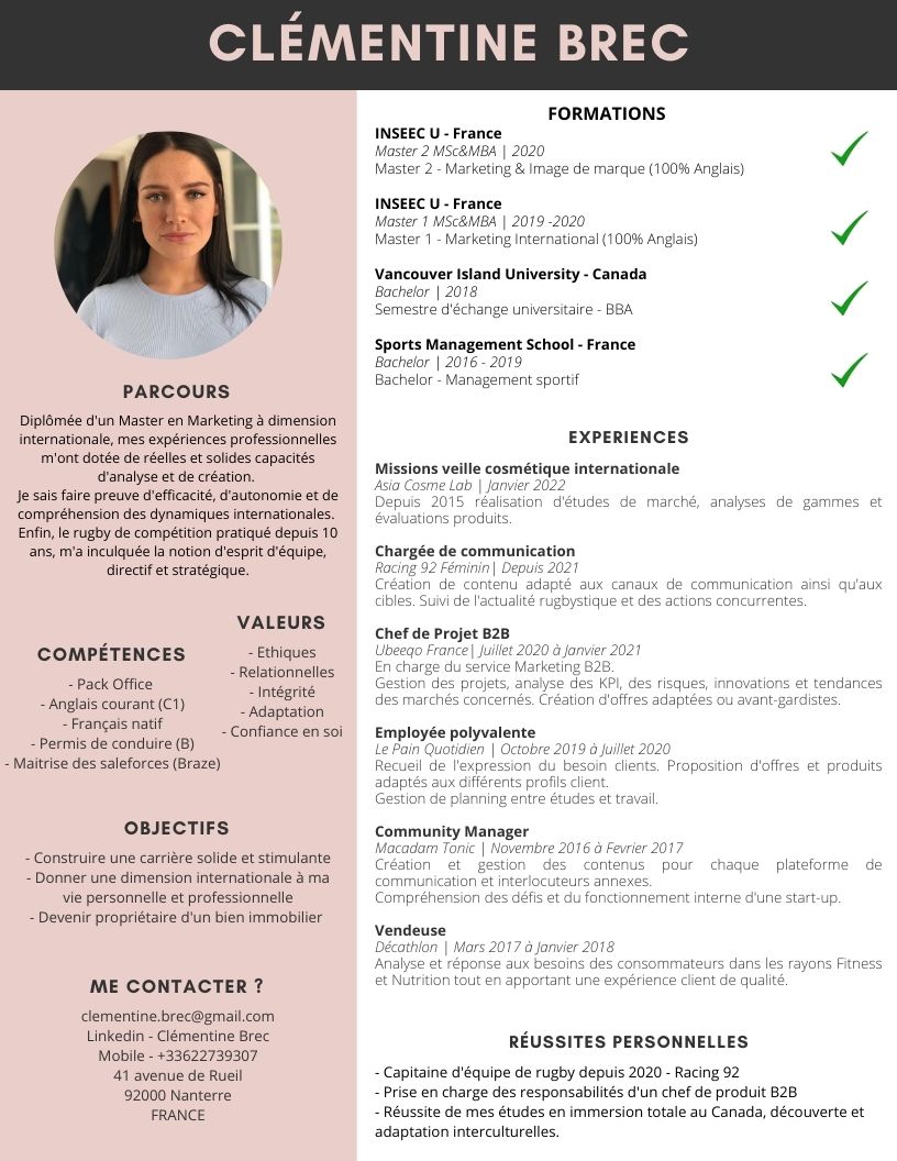 Diplômée d’un Master II Marketing et Image de Marque – INSEEC Paris (cursus 100% anglais), j’ai eu la chance de pouvoir développer quelques expertises en grâce à mon stage au poste de Chef de Projet B2B chez Ubeeqo (6 mois) telles que l’analyse de KPI’s, la création et l’adaptation d’offres et services et une maîtrise des outils CRM (Braze – Sales Force). Ces missions ont mis en lumière le goût du challenge et la recherche constante de résultats et d’axes d’amélioration.