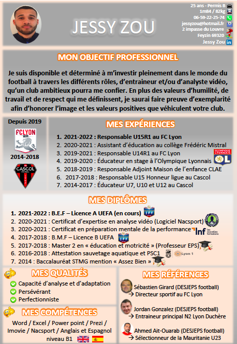 - 2019-2020 : Éducateur en stage à l’Olympique Lyonnais